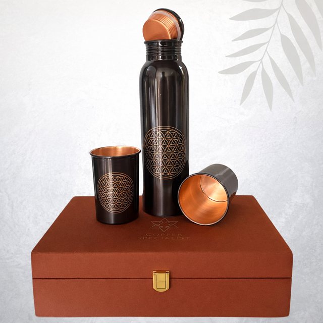 Deze bijzondere handgemaakte set van een fles met flower of life motief in antique uitvoering en 2 bekers is van puur koper en is verpakt in een prachtige fluwelen cadeaudoos.
